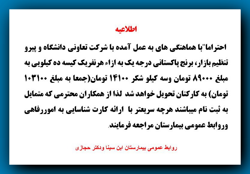 احتراما"با هماهنگی های به عمل آمده با شرکت تعاونی دانشگاه و پیرو تنظیم بازار، برنج پاکستانی درجه یک به ازاء هرنفریک کیسه ده کیلویی به مبلغ 89000 تومان وسه کیلو شکر 14100 تومان(جمعا به مبلغ 103100 تومان) به کارکنان تحویل خواهد شد لذا از همکاران محترمی که متمایل به ثبت نام میباشند هرچه سریعتر با ارائه کارت شناسایی به اموررفاهی وروابط عمومی بیمارستان مراجعه فرمایند.