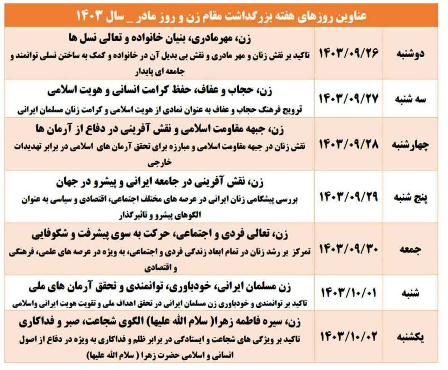 یکشنبه ۲ دی: زن، سیره فاطمه (زهرا سلام الله علیها) الگوی شجاعت، صبر و فداکاری